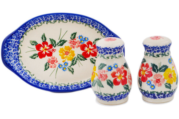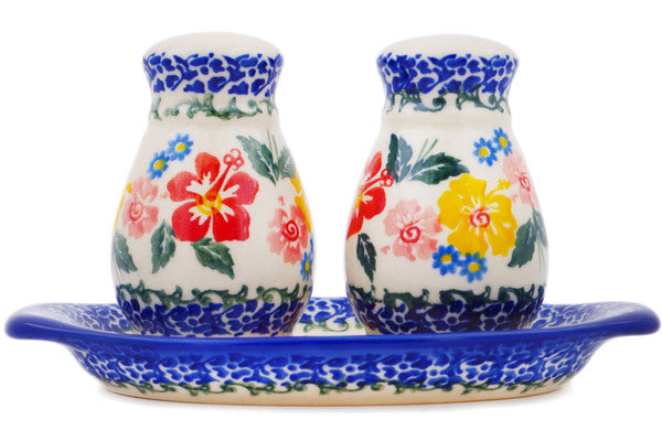 This Hibiscus Haven Salt and Pepper Set was handmade and hand decorated in Boleslawiec, Poland by skilled artisans according to old traditional methods. This Polish stoneware is microwave, dishwasher, freezer, and oven safe up to 480°F. It does not contain lead or cadmium. It is part of the Hibiscus Haven Collection.