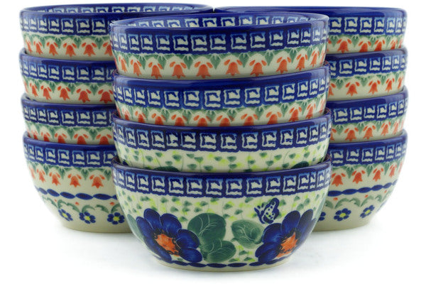 This Brilliant Butterfly Popp Set of 12 Bowls was handmade and hand decorated in Boleslawiec, Poland by skilled artisans according to old traditional methods. This is a Polish pottery Signature Unikat, which means that it has been hand painted with both sponges and brushes and it is signed by the artist who painted it. Unikat pieces are the most intricate works of art. Larger Unikat items take hours of very careful work to finish. This Polish stoneware is microwave, dishwasher, freezer, and oven safe up to 480°F. It does not contain lead or cadmium. It is part of the Brilliant Butterfly Popp Collection.