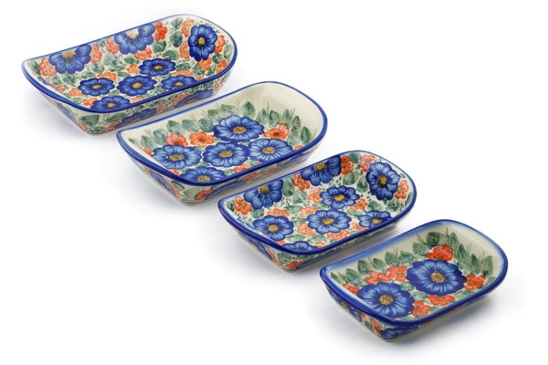 This Flowers In Bloom Set of 4 Rectangular Bakers was handmade and hand decorated in Boleslawiec, Poland by skilled artisans according to old traditional methods. This is a Polish pottery Signature Unikat, which means that it has been hand painted with both sponges and brushes and it is signed by the artist who painted it. Unikat pieces are the most intricate works of art. Larger Unikat items take hours of very careful work to finish. This Polish stoneware is microwave, dishwasher, freezer, and oven safe up to 480°F. It does not contain lead or cadmium. It is part of the Flowers In Bloom Collection.