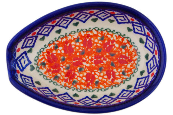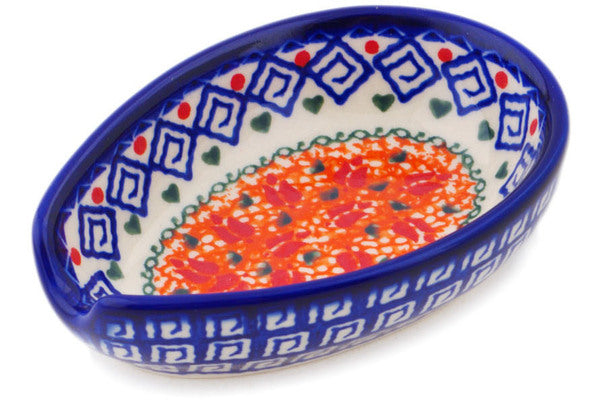 This Grecian Fire Tulips 5" Spoon Rest was handmade and hand decorated in Boleslawiec, Poland by skilled artisans according to old traditional methods. This Polish stoneware is microwave, dishwasher, freezer, and oven safe up to 480°F. It does not contain lead or cadmium. It is part of the Grecian Fire Tulips Collection.