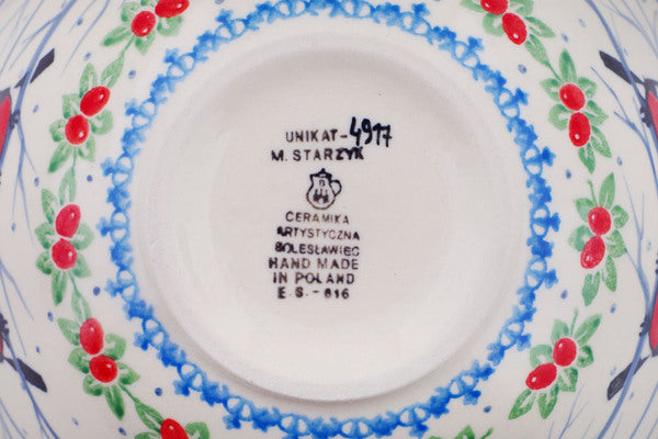 This Bullfinch On Rowan Winter Berries 6" Bowl was handmade and hand decorated in Boleslawiec, Poland by skilled artisans according to old traditional methods. This is a Polish pottery Signature Unikat, which means that it has been hand painted with both sponges and brushes and it is signed by the artist who painted it. Unikat pieces are the most intricate works of art. Larger Unikat items take hours of very careful work to finish. This Polish stoneware is microwave, dishwasher, freezer, and oven safe up to 480°F. It does not contain lead or cadmium. It is part of the Bullfinch On Rowan Winter Berries Collection.