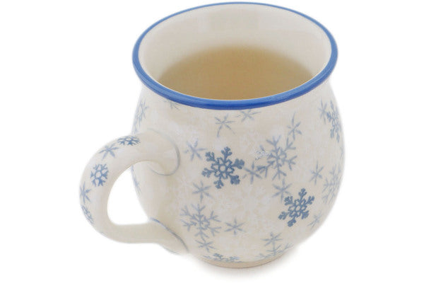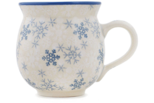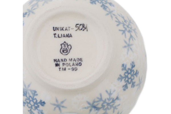 This Silver Snow Fall 12oz Bubble Mug was handmade and hand decorated in Boleslawiec, Poland by skilled artisans according to old traditional methods. This is a Polish pottery Signature Unikat, which means that it has been hand painted with both sponges and brushes and it is signed by the artist who painted it. Unikat pieces are the most intricate works of art. Larger Unikat items take hours of very careful work to finish. This Polish stoneware is microwave, dishwasher, freezer, and oven safe up to 480°F. It does not contain lead or cadmium. It is part of the Silver Snow Fall Collection.