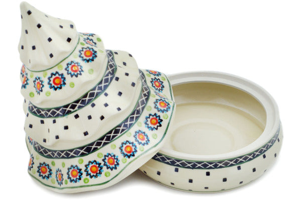 This Divine Simplicity 27 oz Christmas Tree Jar was handmade and hand decorated in Boleslawiec, Poland by skilled artisans according to old traditional methods. This is a Polish pottery Signature Unikat, which means that it has been hand painted with both sponges and brushes and it is signed by the artist who painted it. Unikat pieces are the most intricate works of art. Larger Unikat items take hours of very careful work to finish. This Polish stoneware is microwave, dishwasher, freezer, and oven safe up to 480°F. It does not contain lead or cadmium. It is part of the Divine Simplicity Collection.