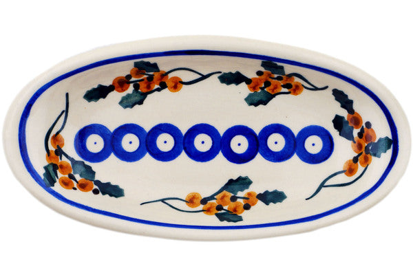 This Yellow Holly Berries 7" Condiment Dish was handmade and hand decorated in Boleslawiec, Poland by skilled artisans according to old traditional methods. This Polish stoneware is microwave, dishwasher, freezer, and oven safe up to 480°F. It does not contain lead or cadmium. It is part of the Yellow Holly Berries Collection.