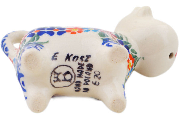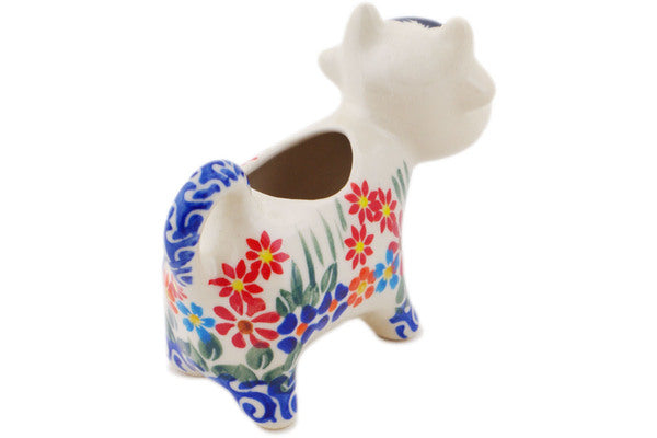 This Blissful Daisy 2 oz Cow Shaped Creamer was handmade and hand decorated in Boleslawiec, Poland by skilled artisans according to old traditional methods. This Polish stoneware is microwave, dishwasher, freezer, and oven safe up to 480°F. It does not contain lead or cadmium. It is part of the Blissful Daisy Collection.