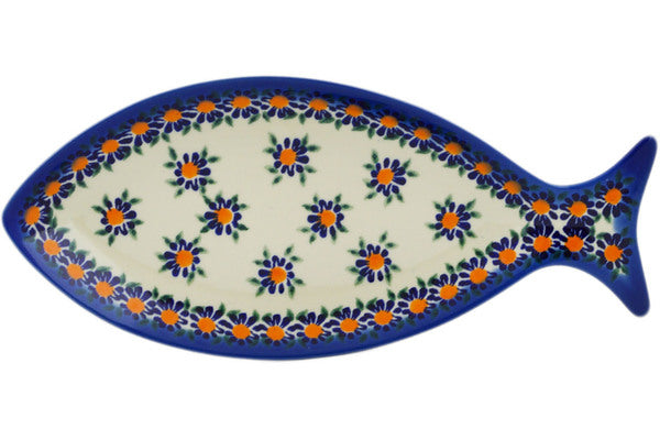 This Blue Daisy 13" Fish Shaped Platter was handmade and hand decorated in Boleslawiec, Poland by skilled artisans according to old traditional methods. This is a Polish pottery Signature Unikat, which means that it has been hand painted with both sponges and brushes and it is signed by the artist who painted it. Unikat pieces are the most intricate works of art. Larger Unikat items take hours of very careful work to finish. This Polish stoneware is microwave, dishwasher, freezer, and oven safe up to 480°F. It does not contain lead or cadmium. It is part of the Blue Daisy Collection.