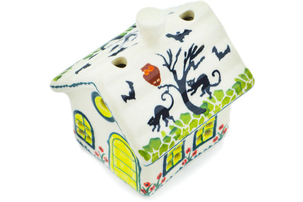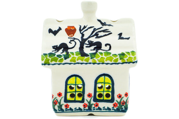 This Halloween Day 4" House Shaped Candle Holder was handmade and hand decorated in Boleslawiec, Poland by skilled artisans according to old traditional methods. This Polish stoneware is microwave, dishwasher, freezer, and oven safe up to 480°F. It does not contain lead or cadmium. It is part of the Halloween Day Collection.