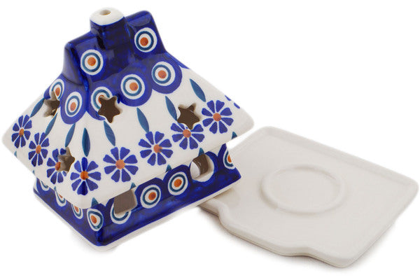 This Peacock 5" House Shaped Candle Holder was handmade and hand decorated in Boleslawiec, Poland by skilled artisans according to old traditional methods. This Polish stoneware is microwave, dishwasher, freezer, and oven safe up to 480°F. It does not contain lead or cadmium. It is part of the Peacock Collection.