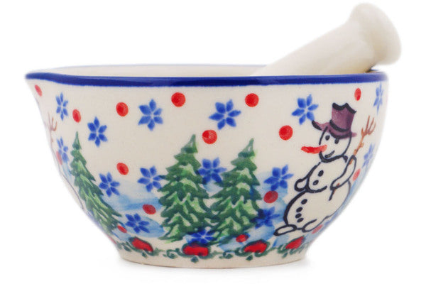 This Dancing Snowman Small Mortar and Pestle was handmade and hand decorated in Boleslawiec, Poland by skilled artisans according to old traditional methods. This is a Polish pottery Signature Unikat, which means that it has been hand painted with both sponges and brushes and it is signed by the artist who painted it. Unikat pieces are the most intricate works of art. Larger Unikat items take hours of very careful work to finish. This Polish stoneware is microwave, dishwasher, freezer, and oven safe up to 480°F. It does not contain lead or cadmium. It is part of the Dancing Snowman Collection.