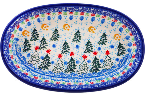 This Glowing Christmas Trees 8" Oval Baker was handmade and hand decorated in Boleslawiec, Poland by skilled artisans according to old traditional methods. This is a Polish pottery Signature Unikat, which means that it has been hand painted with both sponges and brushes and it is signed by the artist who painted it. Unikat pieces are the most intricate works of art. Larger Unikat items take hours of very careful work to finish. This Polish stoneware is microwave, dishwasher, freezer, and oven safe up to 480°F. It does not contain lead or cadmium. It is part of the Glowing Christmas Trees Collection.