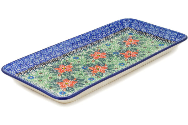 This Red Jackmanii 13" Platter was handmade and hand decorated in Boleslawiec, Poland by skilled artisans according to old traditional methods. This is a Polish pottery Signature Unikat, which means that it has been hand painted with both sponges and brushes and it is signed by the artist who painted it. Unikat pieces are the most intricate works of art. Larger Unikat items take hours of very careful work to finish. This Polish stoneware is microwave, dishwasher, freezer, and oven safe up to 480°F. It does not contain lead or cadmium. It is part of the Red Jackmanii Collection.