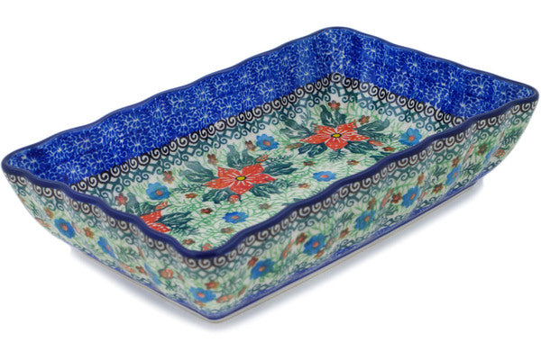 This Red Jackmanii 9" Rectangular Baker was handmade and hand decorated in Boleslawiec, Poland by skilled artisans according to old traditional methods. This is a Polish pottery Signature Unikat, which means that it has been hand painted with both sponges and brushes and it is signed by the artist who painted it. Unikat pieces are the most intricate works of art. Larger Unikat items take hours of very careful work to finish. This Polish stoneware is microwave, dishwasher, freezer, and oven safe up to 480°F. It does not contain lead or cadmium. It is part of the Red Jackmanii Collection.