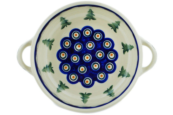 This Peacock Pines 8" Round Baker with Handles was handmade and hand decorated in Boleslawiec, Poland by skilled artisans according to old traditional methods. This Polish stoneware is microwave, dishwasher, freezer, and oven safe up to 480°F. It does not contain lead or cadmium. It is part of the Peacock Pines Collection.