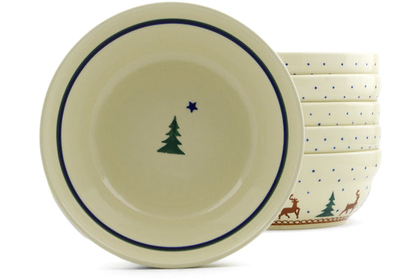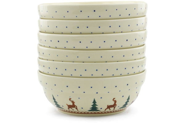 This Reindeer Pines Set of 6 Bowls was handmade and hand decorated in Boleslawiec, Poland by skilled artisans according to old traditional methods. This Polish stoneware is microwave, dishwasher, freezer, and oven safe up to 480°F. It does not contain lead or cadmium. It is part of the Reindeer Pines Collection.