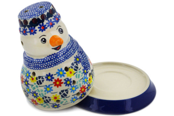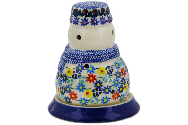 This Primary Spring 5" Snowman Candle Holder was handmade and hand decorated in Boleslawiec, Poland by skilled artisans according to old traditional methods. This is a Polish pottery Signature Unikat, which means that it has been hand painted with both sponges and brushes and it is signed by the artist who painted it. Unikat pieces are the most intricate works of art. Larger Unikat items take hours of very careful work to finish. This Polish stoneware is microwave, dishwasher, freezer, and oven safe up to 480°F. It does not contain lead or cadmium. It is part of the Primary Spring Collection.