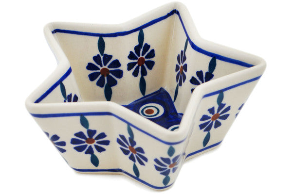 This Peacock 5" Star Shaped Bowl was handmade and hand decorated in Boleslawiec, Poland by skilled artisans according to old traditional methods. This Polish stoneware is microwave, dishwasher, freezer, and oven safe up to 480°F. It does not contain lead or cadmium. It is part of the Peacock Collection.
