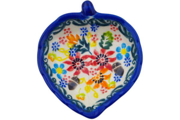 This Acorn Burst 4" Tea Bag or Lemon Plate was handmade and hand decorated in Boleslawiec, Poland by skilled artisans according to old traditional methods. This is a Polish pottery Signature Unikat, which means that it has been hand painted with both sponges and brushes and it is signed by the artist who painted it. Unikat pieces are the most intricate works of art. Larger Unikat items take hours of very careful work to finish. This Polish stoneware is microwave, dishwasher, freezer, and oven safe up to 480°F. It does not contain lead or cadmium. It is part of the Acorn Burst Collection.
