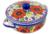 This Brown Mardi Gras 12" Baker with Cover was handmade and hand decorated in Boleslawiec, Poland by skilled artisans according to old traditional methods. This is a Polish pottery Signature Unikat, which means that it has been hand painted with both sponges and brushes and it is signed by the artist who painted it. Unikat pieces are the most intricate works of art. Larger Unikat items take hours of very careful work to finish. This Polish stoneware is microwave, dishwasher, freezer, and oven safe up to 480°F. It does not contain lead or cadmium. It is part of the Brown Mardi Gras Collection.