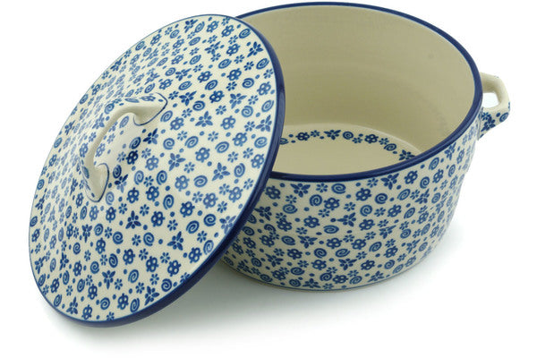 This Blue Confetti 8-inch Dutch Oven was handmade and hand decorated in Boleslawiec, Poland by skilled artisans according to old traditional methods. This Polish stoneware is microwave, dishwasher, freezer, and oven safe up to 480°F. It does not contain lead or cadmium. It is part of the Blue Confetti Collection.