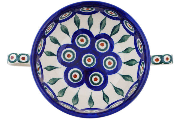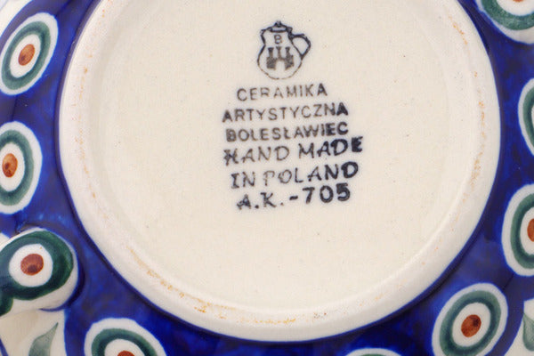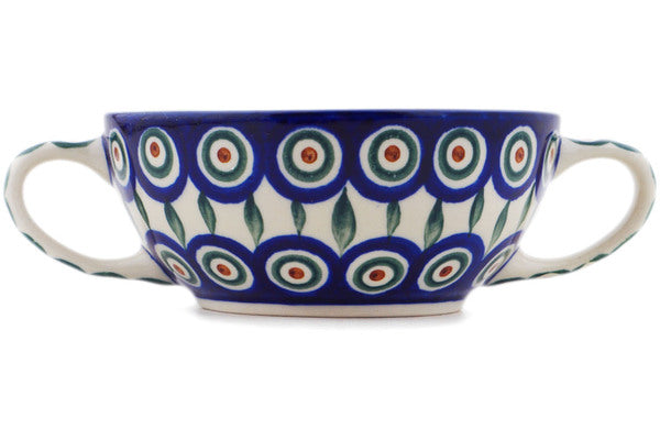 This Peacock Leaves 10 oz Bouillon Cup was handmade and hand decorated in Boleslawiec, Poland by skilled artisans according to old traditional methods. This Polish stoneware is microwave, dishwasher, freezer, and oven safe up to 480°F. It does not contain lead or cadmium. It is part of the Peacock Leaves Collection.