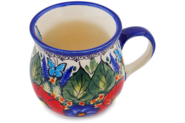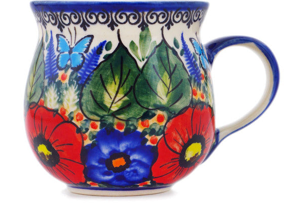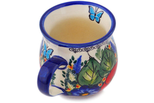 This Butterfly Paradise 8 oz Bubble Mug was handmade and hand decorated in Boleslawiec, Poland by skilled artisans according to old traditional methods. This is a Polish pottery Signature Unikat, which means that it has been hand painted with both sponges and brushes and it is signed by the artist who painted it. Unikat pieces are the most intricate works of art. Larger Unikat items take hours of very careful work to finish. This Polish stoneware is microwave, dishwasher, freezer, and oven safe up to 480°F. It does not contain lead or cadmium. It is part of the Butterfly Paradise Collection.