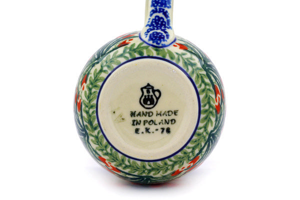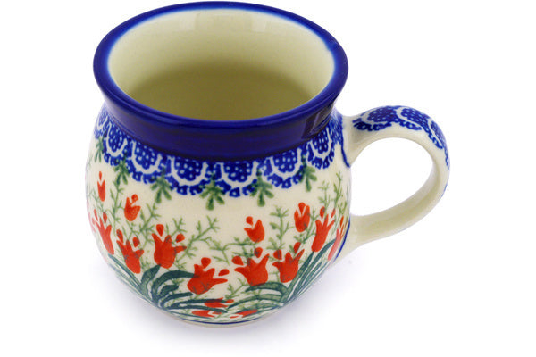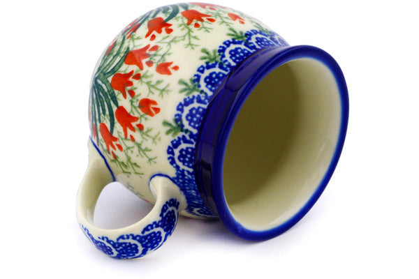 This Crimson Bells 8 oz Bubble Mug was handmade and hand decorated in Boleslawiec, Poland by skilled artisans according to old traditional methods. This Polish stoneware is microwave, dishwasher, freezer, and oven safe up to 480°F. It does not contain lead or cadmium. It is part of the Crimson Bells Collection.