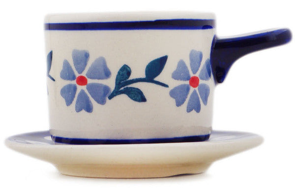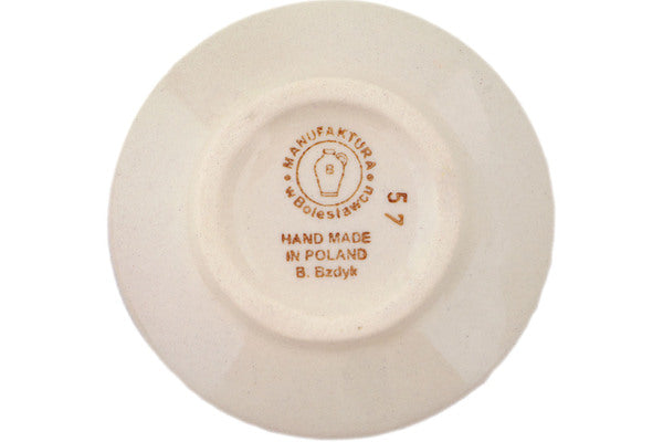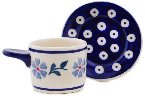 This Peacock Forget-Me-Not 2 oz Cup was handmade and hand decorated in Boleslawiec, Poland by skilled artisans according to old traditional methods. This Polish stoneware is microwave, dishwasher, freezer, and oven safe up to 480°F. It does not contain lead or cadmium. It is part of the Peacock Forget-Me-Not Collection.