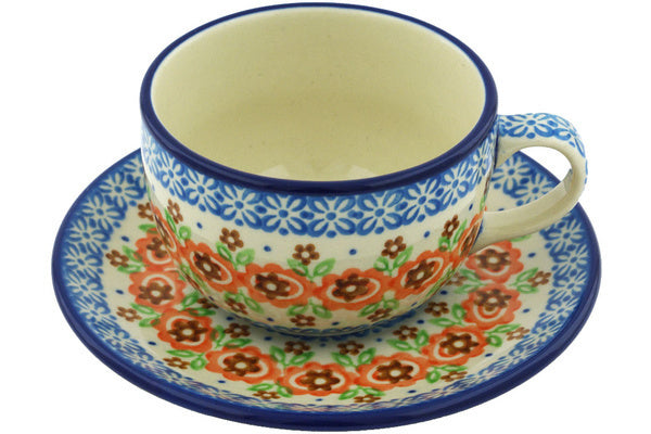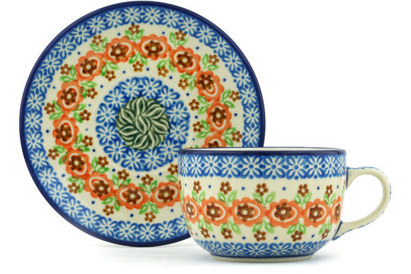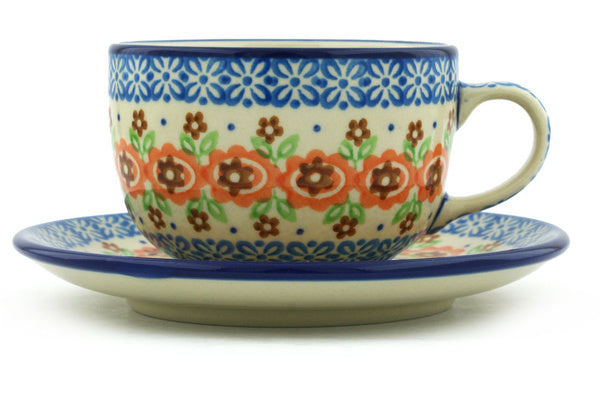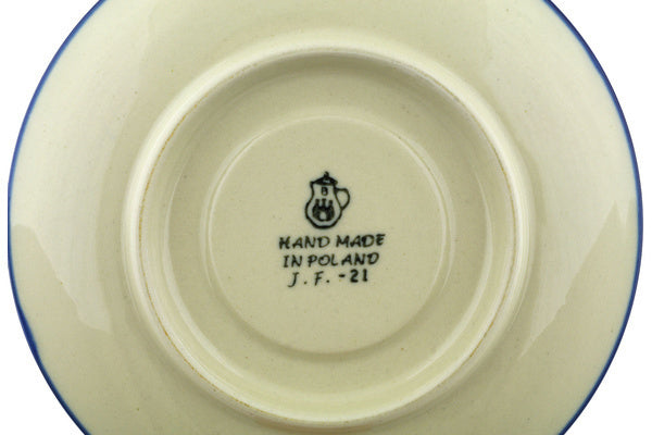 This Peach Daisy 4 oz Cup with Saucer was handmade and hand decorated in Boleslawiec, Poland by skilled artisans according to old traditional methods. This Polish stoneware is microwave, dishwasher, freezer, and oven safe up to 480°F. It does not contain lead or cadmium. It is part of the Peach Daisy Collection.