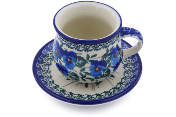 This Blue Pansy 3 oz Espresso Cup with Saucer was handmade and hand decorated in Boleslawiec, Poland by skilled artisans according to old traditional methods. This Polish stoneware is microwave, dishwasher, freezer, and oven safe up to 480°F. It does not contain lead or cadmium. It is part of the Blue Pansy Collection.
