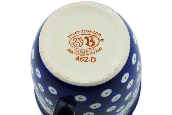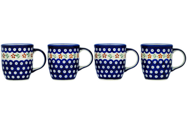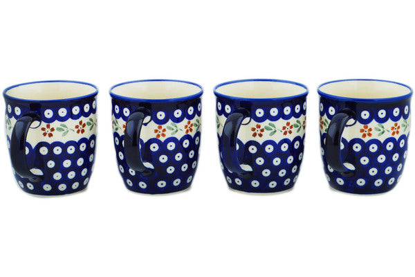 This Red Daisy Peacock Set of Four 12oz Mugs was handmade and hand decorated in Boleslawiec, Poland by skilled artisans according to old traditional methods. This Polish stoneware is microwave, dishwasher, freezer, and oven safe up to 480°F. It does not contain lead or cadmium. It is part of the Red Daisy Peacock Collection.