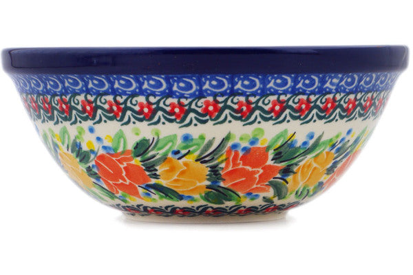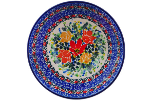 This Red And Yellow Flowers 6" Bowl was handmade and hand decorated in Boleslawiec, Poland by skilled artisans according to old traditional methods. This is a Polish pottery Signature Unikat, which means that it has been hand painted with both sponges and brushes and it is signed by the artist who painted it. Unikat pieces are the most intricate works of art. Larger Unikat items take hours of very careful work to finish. This Polish stoneware is microwave, dishwasher, freezer, and oven safe up to 480°F. It does not contain lead or cadmium. It is part of the Red And Yellow Flowers Collection.