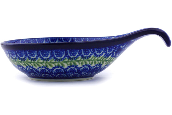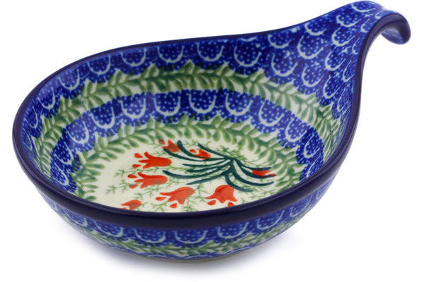 This Crimson Bells 7" Condiment Dish was handmade and hand decorated in Boleslawiec, Poland by skilled artisans according to old traditional methods. This Polish stoneware is microwave, dishwasher, freezer, and oven safe up to 480°F. It does not contain lead or cadmium. It is part of the Crimson Bells Collection.