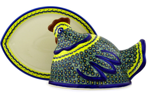 This Peacock Bumble Bee 14" Dish with Hen Cover was handmade and hand decorated in Boleslawiec, Poland by skilled artisans according to old traditional methods. This Polish stoneware is microwave, dishwasher, freezer, and oven safe up to 480°F. It does not contain lead or cadmium. It is part of the Peacock Bumble Bee Collection.