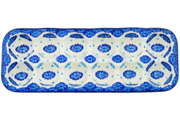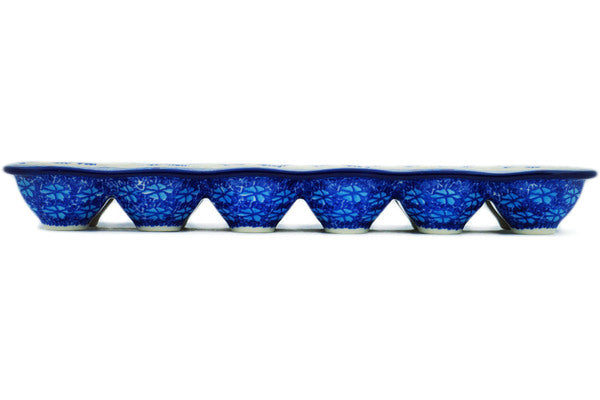 This Deep Into The Blue Sea 13" Egg Crate was handmade and hand decorated in Boleslawiec, Poland by skilled artisans according to old traditional methods. This Polish stoneware is microwave, dishwasher, freezer, and oven safe up to 480°F. It does not contain lead or cadmium. It is part of the Deep Into The Blue Sea Collection.