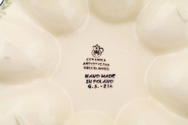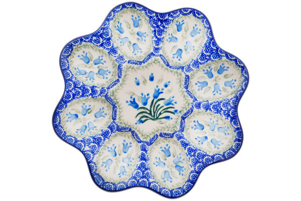 This Feathery Bluebells 9" Egg Plate was handmade and hand decorated in Boleslawiec, Poland by skilled artisans according to old traditional methods. This Polish stoneware is microwave, dishwasher, freezer, and oven safe up to 480°F. It does not contain lead or cadmium. It is part of the Feathery Bluebells Collection.