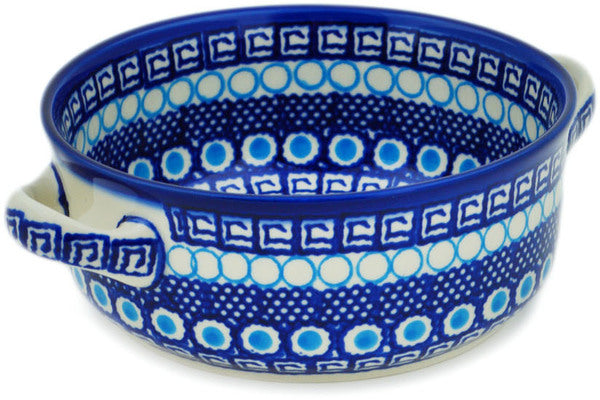 This Tribal Blue 8" Round Baker with Handles was handmade and hand decorated in Boleslawiec, Poland by skilled artisans according to old traditional methods. This Polish stoneware is microwave, dishwasher, freezer, and oven safe up to 480°F. It does not contain lead or cadmium. It is part of the Tribal Blue Collection.