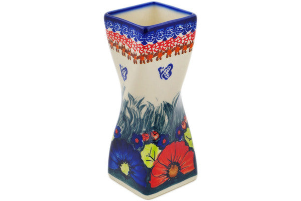 This Butterfly Splendor 7" Vase was handmade and hand decorated in Boleslawiec, Poland by skilled artisans according to old traditional methods. This is a Polish pottery Signature Unikat, which means that it has been hand painted with both sponges and brushes and it is signed by the artist who painted it. Unikat pieces are the most intricate works of art. Larger Unikat items take hours of very careful work to finish. This Polish stoneware is microwave, dishwasher, freezer, and oven safe up to 480°F. It does not contain lead or cadmium. It is part of the Butterfly Splendor Collection.