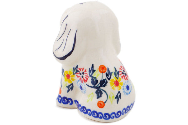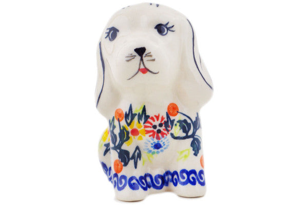 This Pastel Spring Wreath 4" Dog Figurine was handmade and hand decorated in Boleslawiec, Poland by skilled artisans according to old traditional methods. This Polish stoneware is microwave, dishwasher, freezer, and oven safe up to 480°F. It does not contain lead or cadmium. It is part of the Pastel Spring Wreath Collection.