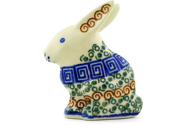 This Grecian Sea 3" Bunny Figurine was handmade and hand decorated in Boleslawiec, Poland by skilled artisans according to old traditional methods. This Polish stoneware is microwave, dishwasher, freezer, and oven safe up to 480°F. It does not contain lead or cadmium. It is part of the Grecian Sea Collection.