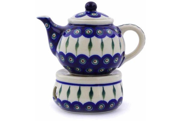 This Peacock Leaves 4" Mini Teapot with Heater was handmade and hand decorated in Boleslawiec, Poland by skilled artisans according to old traditional methods. This Polish stoneware is microwave, dishwasher, freezer, and oven safe up to 480°F. It does not contain lead or cadmium. It is part of the Peacock Leaves Collection.