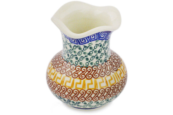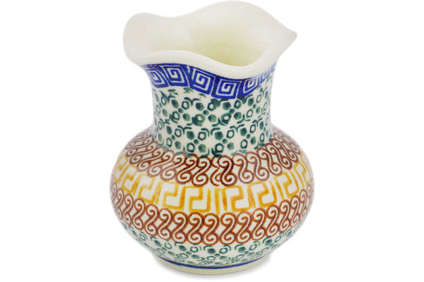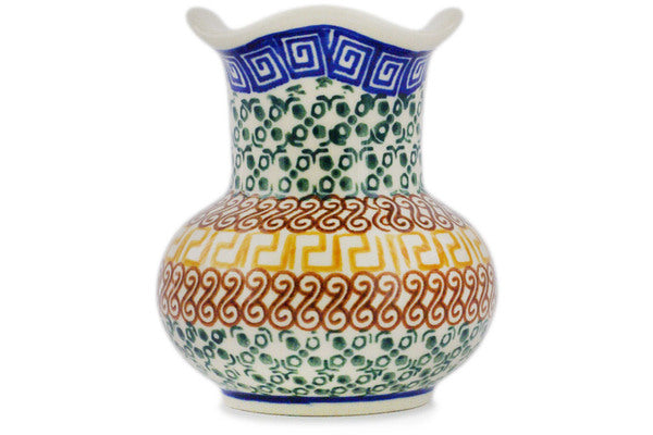 This Grecian Sea 4" Vase was handmade and hand decorated in Boleslawiec, Poland by skilled artisans according to old traditional methods. This Polish stoneware is microwave, dishwasher, freezer, and oven safe up to 480°F. It does not contain lead or cadmium. It is part of the Grecian Sea Collection.
