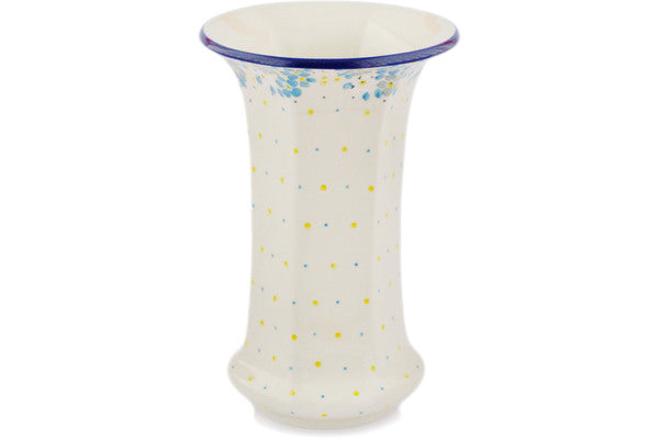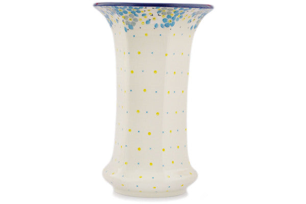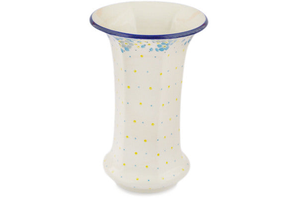 This Flowers Under The Starry Sky 9" Vase was handmade and hand decorated in Boleslawiec, Poland by skilled artisans according to old traditional methods. This Polish stoneware is microwave, dishwasher, freezer, and oven safe up to 480°F. It does not contain lead or cadmium. It is part of the Flowers Under The Starry Sky Collection.