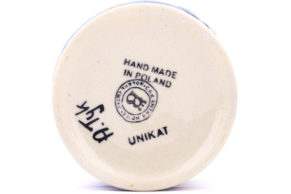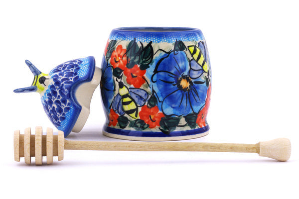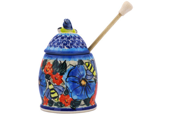 This Blue As Your Eyes 6" Honey Jar with Dipper was handmade and hand decorated in Boleslawiec, Poland by skilled artisans according to old traditional methods. This is a Polish pottery Signature Unikat, which means that it has been hand painted with both sponges and brushes and it is signed by the artist who painted it. Unikat pieces are the most intricate works of art. Larger Unikat items take hours of very careful work to finish. This Polish stoneware is microwave, dishwasher, freezer, and oven safe up to 480°F. It does not contain lead or cadmium. It is part of the Blue As Your Eyes Collection.