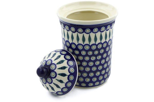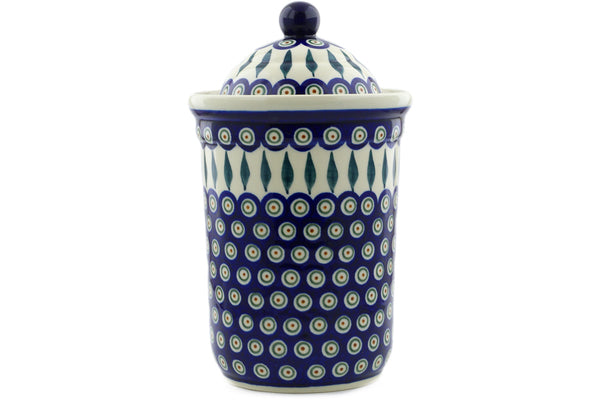 This Peacock Leaves 11" Jar with Lid was handmade and hand decorated in Boleslawiec, Poland by skilled artisans according to old traditional methods. This Polish stoneware is microwave, dishwasher, freezer, and oven safe up to 480°F. It does not contain lead or cadmium. It is part of the Peacock Leaves Collection.