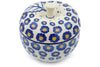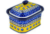 This Sunburst Daisies 9" Jar with Lid and Handles was handmade and hand decorated in Boleslawiec, Poland by skilled artisans according to old traditional methods. This Polish stoneware is microwave, dishwasher, freezer, and oven safe up to 480°F. It does not contain lead or cadmium. It is part of the Sunburst Daisies Collection.