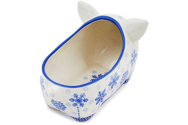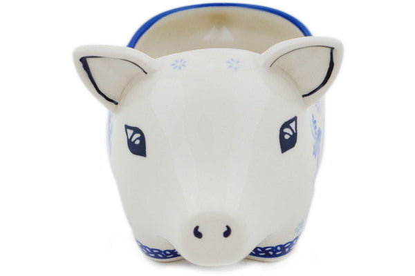This Winter Sights 6" Pig Shaped Jar was handmade and hand decorated in Boleslawiec, Poland by skilled artisans according to old traditional methods. This is a Polish pottery Signature Unikat, which means that it has been hand painted with both sponges and brushes and it is signed by the artist who painted it. Unikat pieces are the most intricate works of art. Larger Unikat items take hours of very careful work to finish. This Polish stoneware is microwave, dishwasher, freezer, and oven safe up to 480°F. It does not contain lead or cadmium. It is part of the Winter Sights Collection.