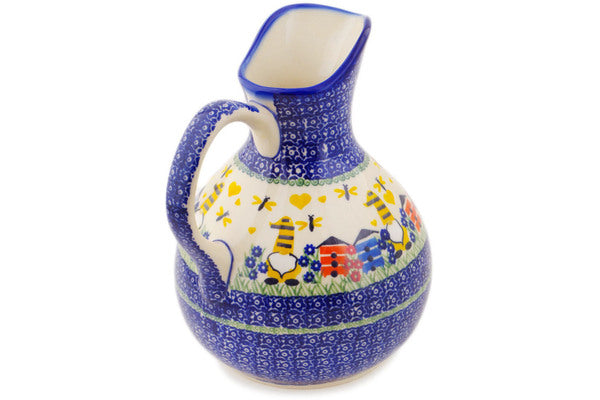 This Beekeeper Gnome 10 Cup Pitcher was handmade and hand decorated in Boleslawiec, Poland by skilled artisans according to old traditional methods. This is a Polish pottery Signature Unikat, which means that it has been hand painted with both sponges and brushes and it is signed by the artist who painted it. Unikat pieces are the most intricate works of art. Larger Unikat items take hours of very careful work to finish. This Polish stoneware is microwave, dishwasher, freezer, and oven safe up to 480°F. It does not contain lead or cadmium. It is part of the Beekeeper Gnome Collection.