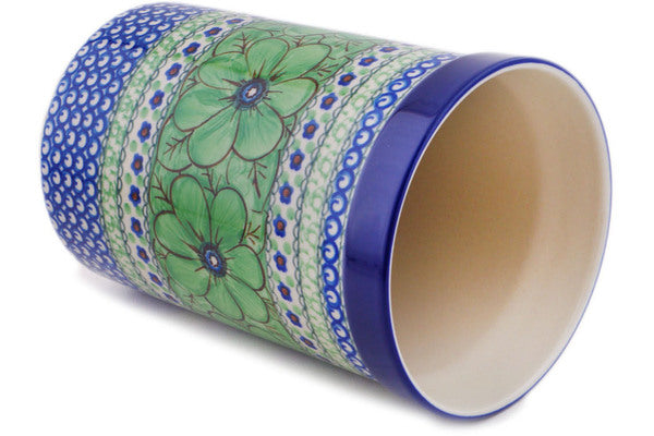 This Green Pansies 8" Utensil Jar was handmade and hand decorated in Boleslawiec, Poland by skilled artisans according to old traditional methods. This is a Polish pottery Signature Unikat, which means that it has been hand painted with both sponges and brushes and it is signed by the artist who painted it. Unikat pieces are the most intricate works of art. Larger Unikat items take hours of very careful work to finish. This Polish stoneware is microwave, dishwasher, freezer, and oven safe up to 480°F. It does not contain lead or cadmium. It is part of the Green Pansies Collection.