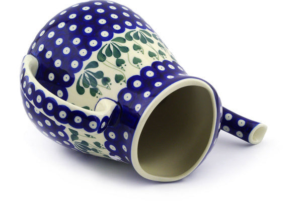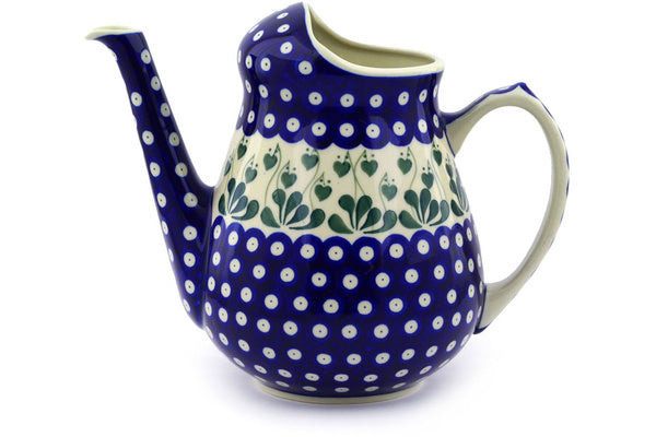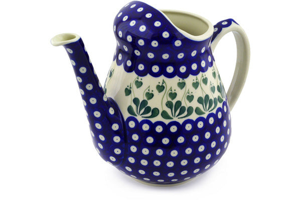 This Bleeding Heart Peacock 71 oz Watering Can was handmade and hand decorated in Boleslawiec, Poland by skilled artisans according to old traditional methods. This Polish stoneware is microwave, dishwasher, freezer, and oven safe up to 480°F. It does not contain lead or cadmium. It is part of the Bleeding Heart Peacock Collection.