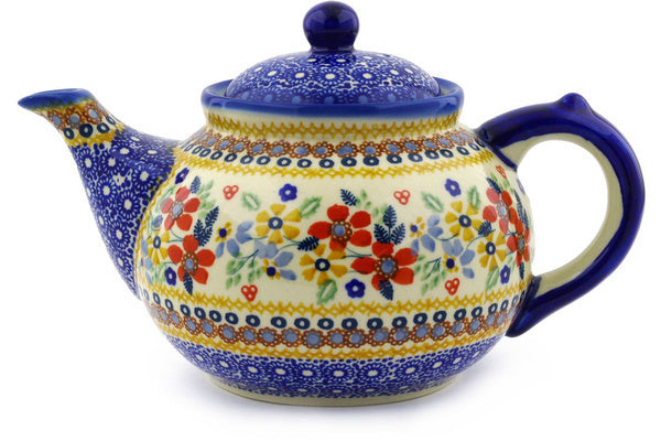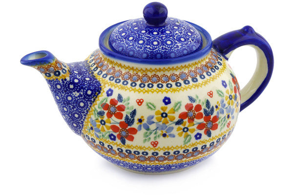 This Summer Bouquet 47 oz Tea or Coffee Pot was handmade and hand decorated in Boleslawiec, Poland by skilled artisans according to old traditional methods. This is a Polish pottery Signature Unikat, which means that it has been hand painted with both sponges and brushes and it is signed by the artist who painted it. Unikat pieces are the most intricate works of art. Larger Unikat items take hours of very careful work to finish. This Polish stoneware is microwave, dishwasher, freezer, and oven safe up to 480°F. It does not contain lead or cadmium. It is part of the Summer Bouquet Collection.